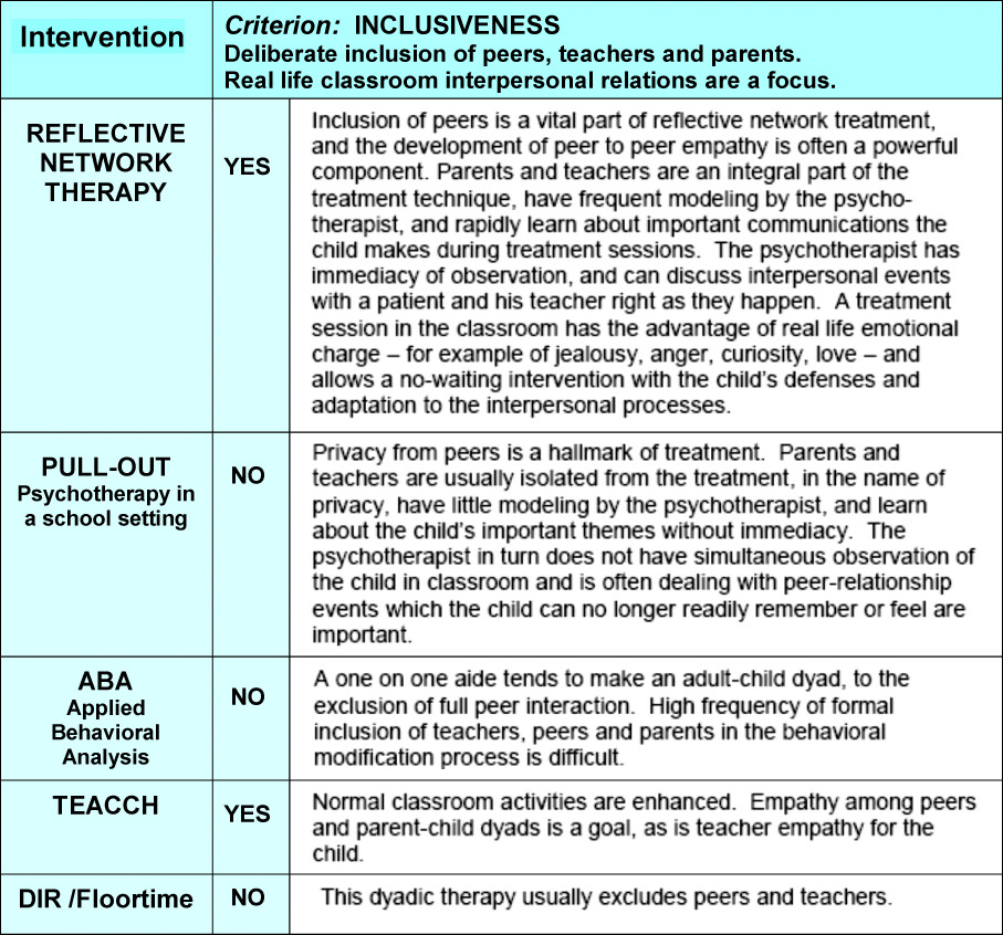 Reflective Network Therapy has been used effectively in many settings: in a full time dedicated RNT preschool; in part-day and full-day therapeutic preschools or day care centers where young children with ASD and SED are included; as a separate class- room service such as in public school special education; as an enrichment to ongoing special education or therapeutic preschool classrooms, including in a preschool serving recently homeless children.